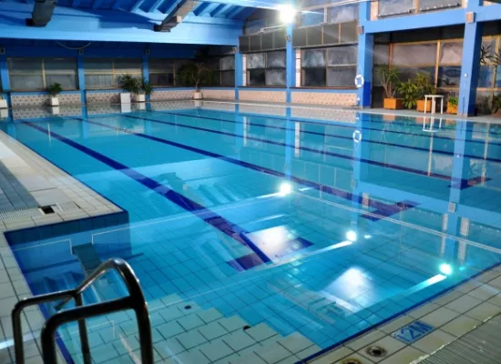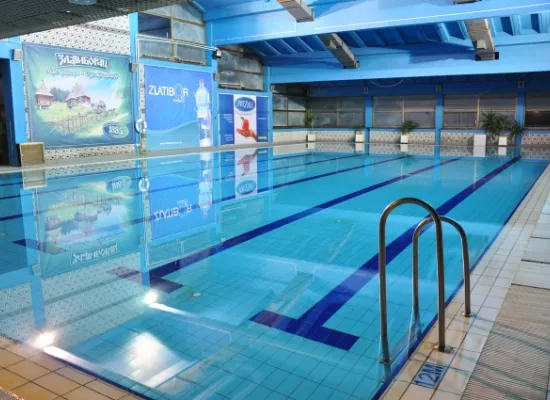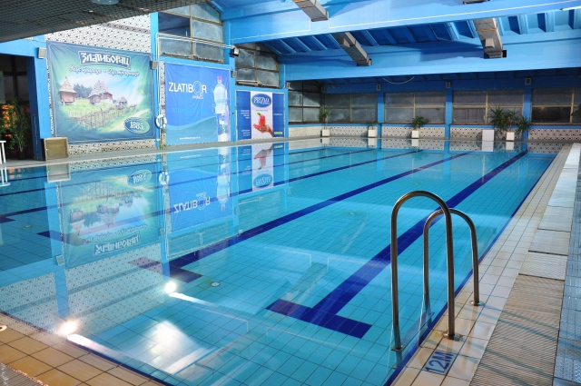Zatvoren poluolimpijski bazen, dimenzija 25m x 12,5m sa nivelisanim dnom dubine, počevši od 1,20m do 1,80m.