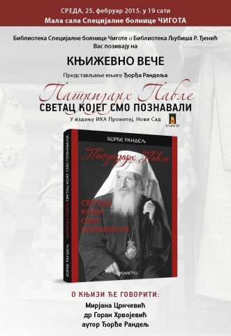 Književno veče u ČIGOTI - Đorđe Randelj - Patrijarh Pavle - svetac kojeg smo poznavali 23. Feb 2015. Kulturne delatnosti INFO Biblioteka Specijalne bolnice Čigota i Biblioteka Ljubiša R. Đenić iz Čajetine, Vas pozivaju na književno veče Đorđa Randelja. Mala sala Specijalne bolnice Čigota, 25. februara 2015. u 19 sati.