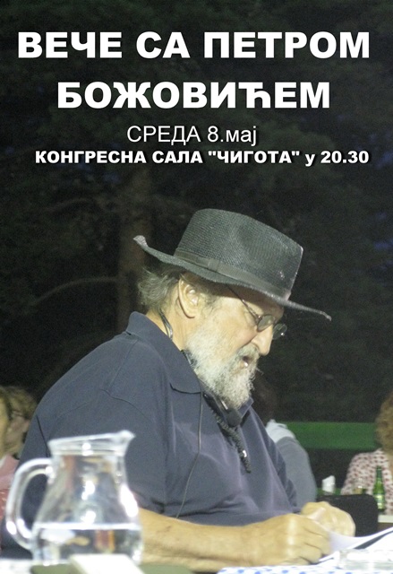 Veče sa Petrom Božovićem 06. May 2019. Kongresi SEMINARI U ČIGOTI® na Zlatiboru, u sredu, 8. maja 2019. održaće se Veče sa Petrom Božovićem, poznatim srpskim pozorišnim i filmskim glumcem. Veče će biti u Kongresnoj sali ČIGOTE® u 20.30 Ulaz je slobodan