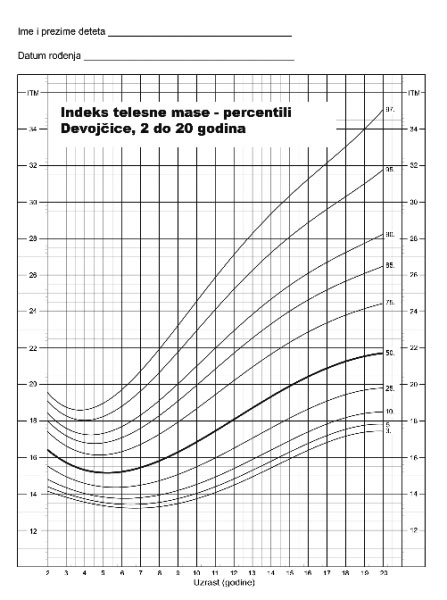 Grafikon 1. Indeks telesne mase (percentili) kod devojčica uzrasta od 2-20 godina