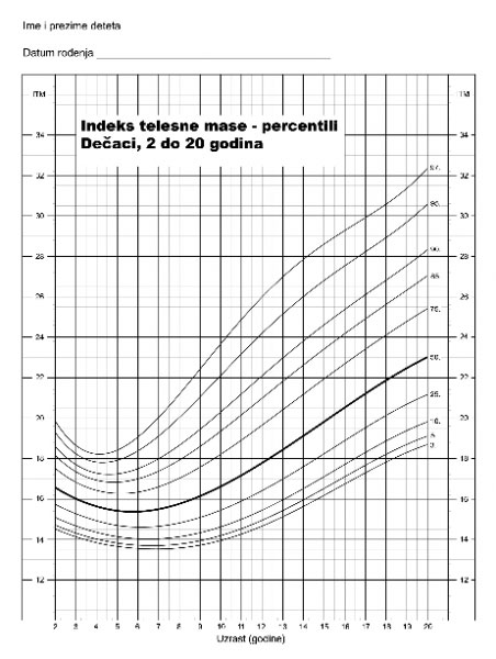 Grafikon 2. Indeks telesne mase (percentili) kod dečaka uzrasta od 2-20 godina