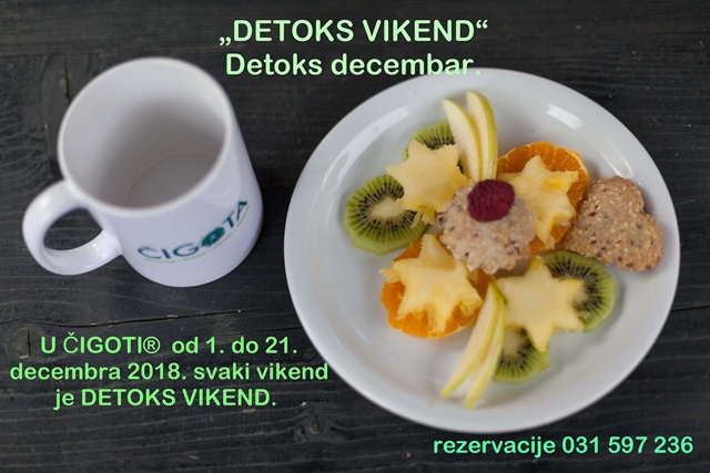 U ČIGOTI®  od 1. do 21. decembra 2018. svaki vikend je DETOKS VIKEND. Boravak je na bazi dva polupansiona. Postoji mogućnost da se odlučite i za ČIGOTA® ishranu. U okviru ovog vikenda Vam nudimo: merenje telesne mase i određivanje telesnog sastava na In body aparatu, pregled lekara specijaliste, jednu limfnu drenažu, jednu anticelulit masažu, jednu konsultaciju sa dijetetičarom nutricionistom, dva korišćenja bazena sa akva aerobikom i dve ČIGOTA® šetnje . Ovu lepezu usluga koristite za samo 11.250 dinara po osobi. U cenu je uračunata i boravišna taksa.