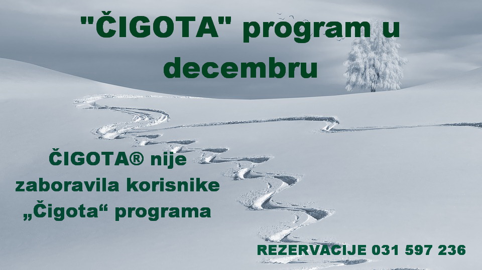 DECEMBAR U ČIGOTI® ZA VAS 23. Nov 2018. Čigota program INFO „Čigota“ program u decembru ČIGOTA® nije zaboravila korisnike „Čigota“ programa. Svi koji dođu na ovaj najpoznatiji program na Balkanu, u periodu od 1. do 21. decembra 2018. dobijaju tri besplatna dana ovog programa u 2019. Dobro došli!