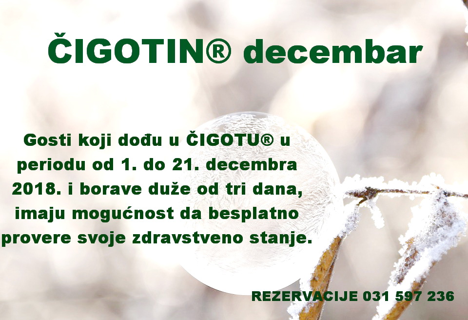 Svi gosti koji dođu u ČIGOTU® u periodu od 1. do 21. decembra 2018. i borave duže od tri dana, imaju mogućnost da besplatno provere svoje zdravstveno stanje. Provera obuhvata biohemijske analize, EKG o pregled lekara specijaliste interne medicine. Boravak je na bazi polupansiona.