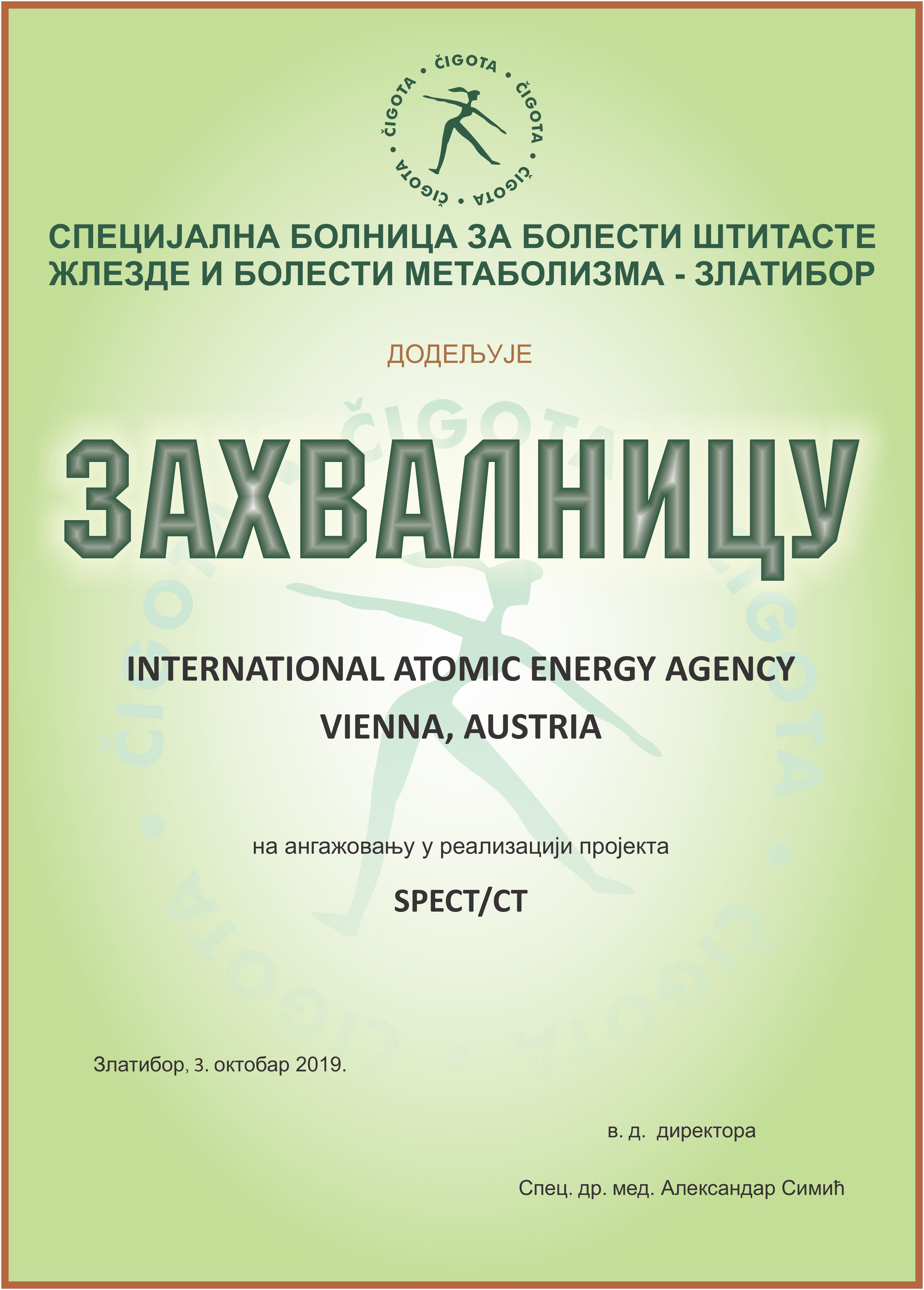 U četvrtak, 3. oktobra 2019. Specijalnu bolnicu ČIGOTA na Zlatiboru su posetili Tomoko Furusava, projekt menadžer Međunarodne agencije za atomsku energiju u Beču, Milijana Steljić nacionalni koordinator iz Agencije za zaštitu od jonizujućeg zračenja i nuklearnu sigurnost Srbije, Nebojša Jokić, viši savetnik, načelnik Odeljenja za zdravstvenu zaštitu i razvoj ljudskih resursa u Ministarstvu zdravlja, kako bi ostvarili uvid u implementaciju projekta nabavke SPECT-CT, hibridnog sistema, kroz program tehničke saradnje Vlade Republike Srbije sa Međunarodnom agencijom za atomsku energiju u Beču